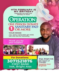 In a move blending philanthropy with celebration, Engr. Bright Irek, popularly known as De Agent of Change, marked his birthday on February 11, 2026, by distributing sanitary pads to more than 400 female secondary school students across five schools in Obubra, Akpabuyo, and Abuja.